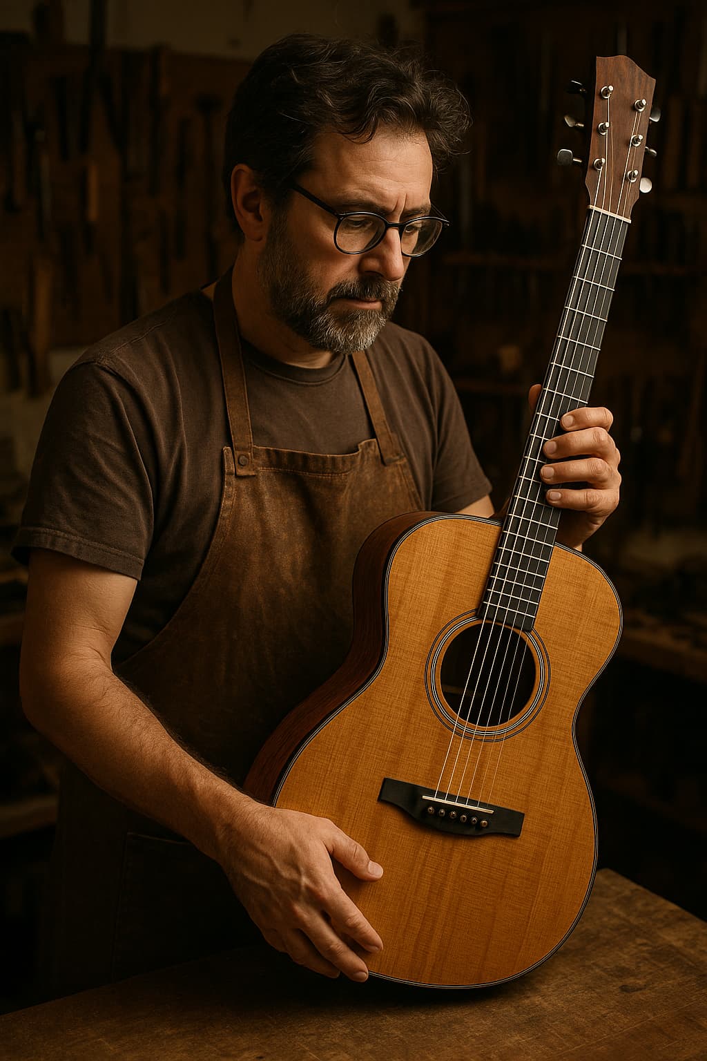 수많은 기타 브랜드가 공장 생산 시스템을 채택하는 시대에도 오직 손끝으로 하나의 예술 작품을 창조하는 사람들이 있다.이들은 루시어(Luthier)라 불리는 1인 제작자들로, 기타 제작의 전 과정을 직접 설계하고 마감하며 오직 '사운드와 공명'이라는 하나의 목표를 위해 인생을 건다. 이번 5부에서는 루시어 중심 하이엔드 기타의 정점에 있는 세계적인 제작자 8인을 선정해 소개한다. Julian Gaffney Guitars활동 지역: 미국 뉴욕출신/사사: 어윈 소모지(Ervin Somogyi) 제자대표 모델: OM, Mod-D, Fingerstyle특징: 라우드하면서도 부드러운 발음, 소모지 스타일의 세심한 음색 조율사용 아티스트: Antoine Dufour, Don Alder줄리안 게프니는 ‘소모지 계열 루..