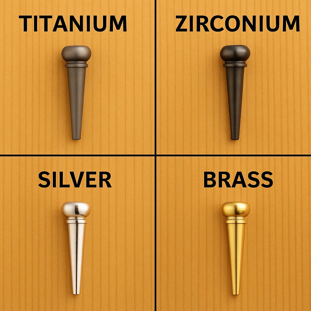 기타(기타) 브릿지핀(Bridge Pin)은 일반적으로 목재나 뼈 소재가 주를 이루지만, 현대 기타 시장에서는 금속이나 고밀도 합성소재로 제작된 핀도 점점 인기를 얻고 있다. 이는 보다 특화된 음향 특성과 내구성, 그리고 유지관리의 편의성을 원하는 연주자들의 니즈에 부합하기 때문이다. 이번 글에서는 대표적인 금속 브릿지핀과 주요 합성 재료들을 정리하고, 각각의 사운드 특성과 특징을 비교하고 다음과 같은 기준으로 브릿지 소재에 대한 성향을 제시한다. ※ H = 최고음역 / M = 중음역 / B = 저음역 / S = 서스테인 / O = 배음 / T = 총합 특성 금속 소재 브릿지핀티타늄(Titanium)음향특성: H=3.6, M=3.4, B=3.9, S=4.1, O=3.8, T=3.8외관: 회색빛 금속 광택..